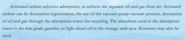 Asaithe roghnacha carbóin gníomhachtaithe, chun an ola agus an gás ar leithligh ón aer a bhaint amach.